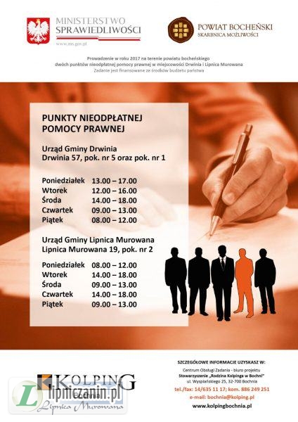 Stowarzyszenie „Rodzina Kolpinga w Bochni” w ramach zadania publicznego „Prowadzenie w roku 2017 na terenie powiatu bocheńskiego dwóch punktów nieodpłatnej pomocy prawnej w miejscowości Drwinia i Lipnica Murowana” realizowanego na podstawie umowy zawartej z Powiatem Bocheńskim prowadzi dwa punkty nieodpłatnej pomocy prawnej w miejscowości Drwinia i Lipnica Murowana.