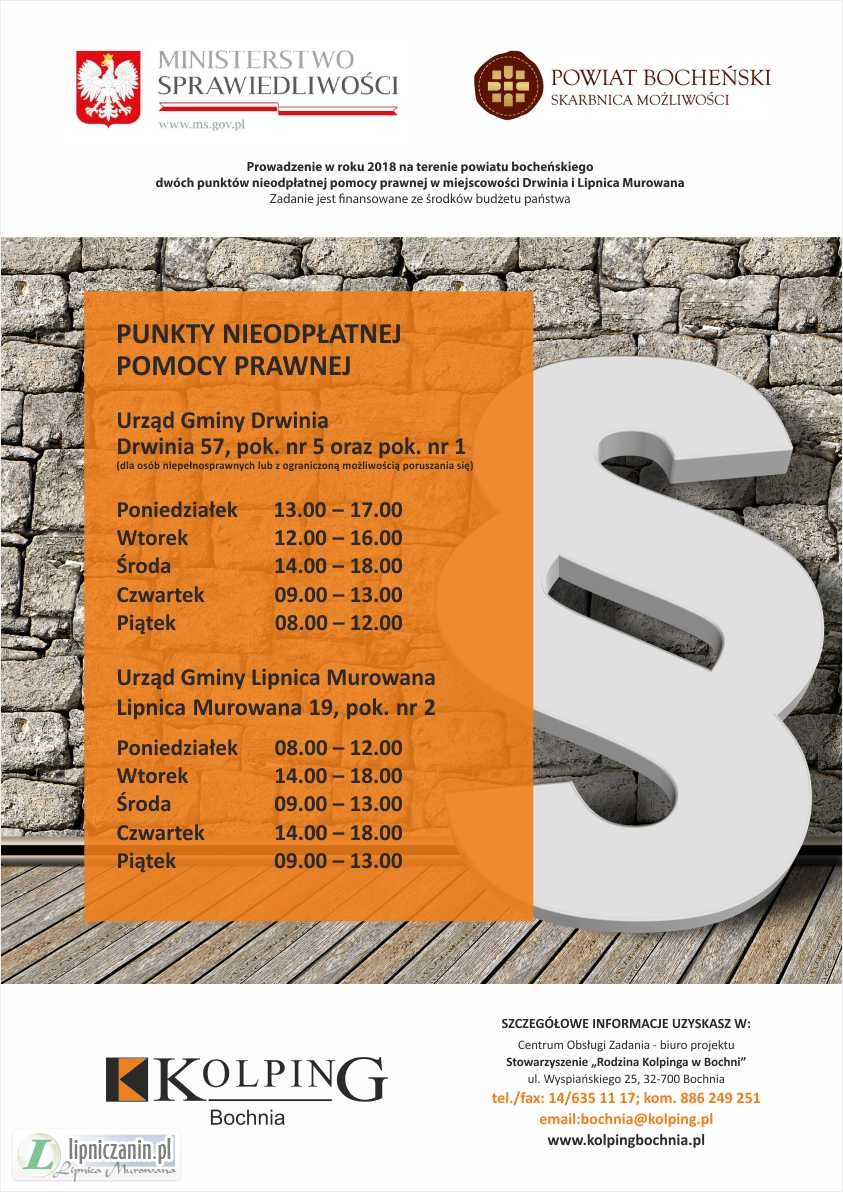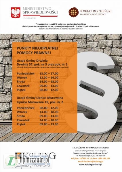 Nieodpłatna pomoc prawna działa już od niemal trzech lat, na terenie powiatu bocheńskiego funkcjonują cztery punkty nieodpłatnej pomocy prawnej, dwa punkty nieodpłatnej pomocy prawnej są ulokowane w miejscowości Lipnica Murowana i Drwinia, punkty te prowadzi Stowarzyszenie „Rodzina Kolpinga w Bochni”.